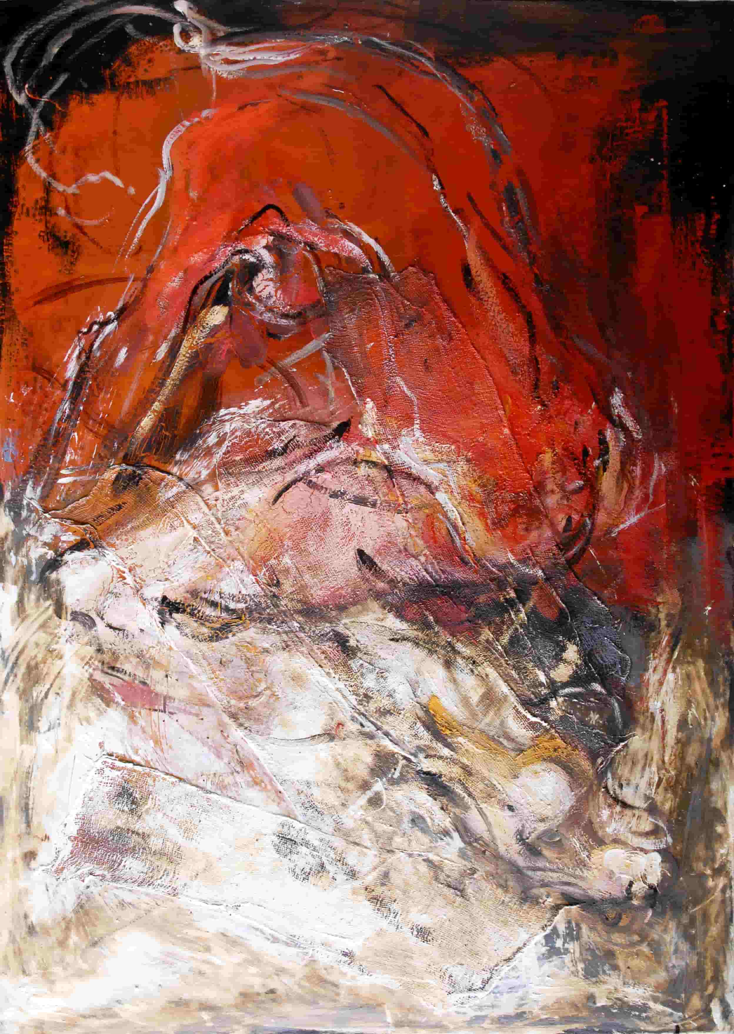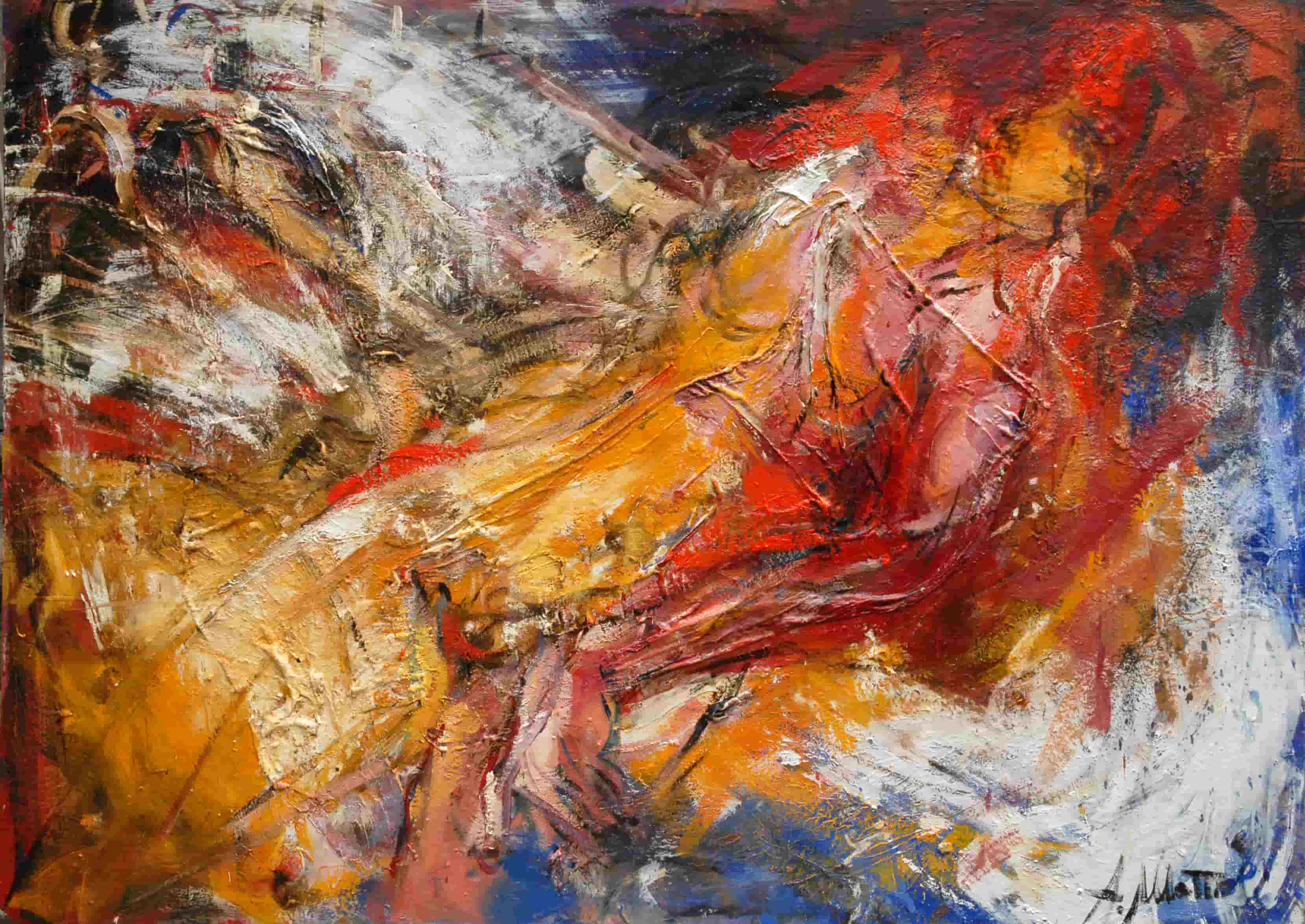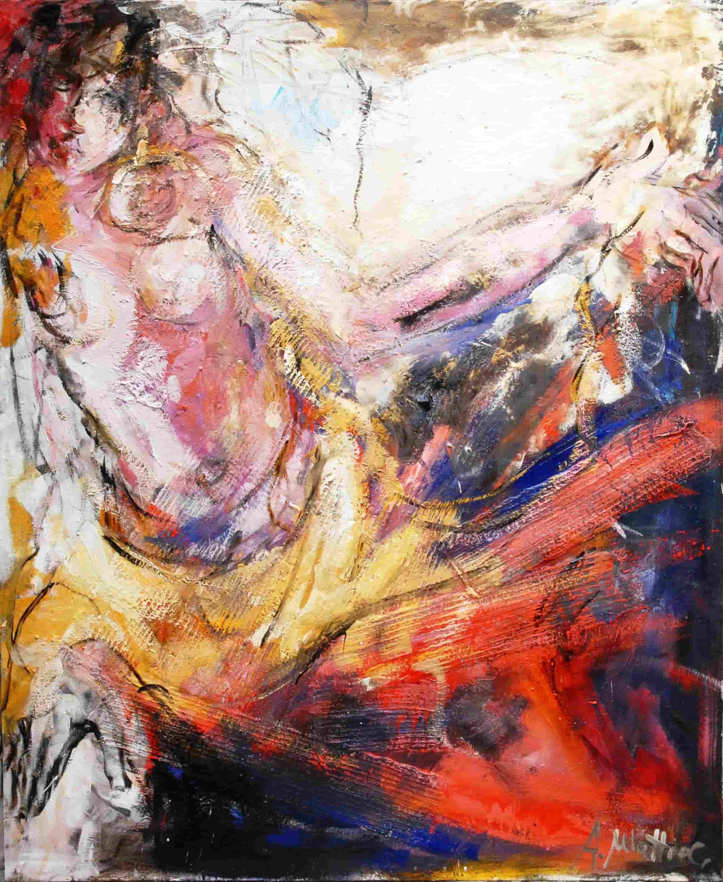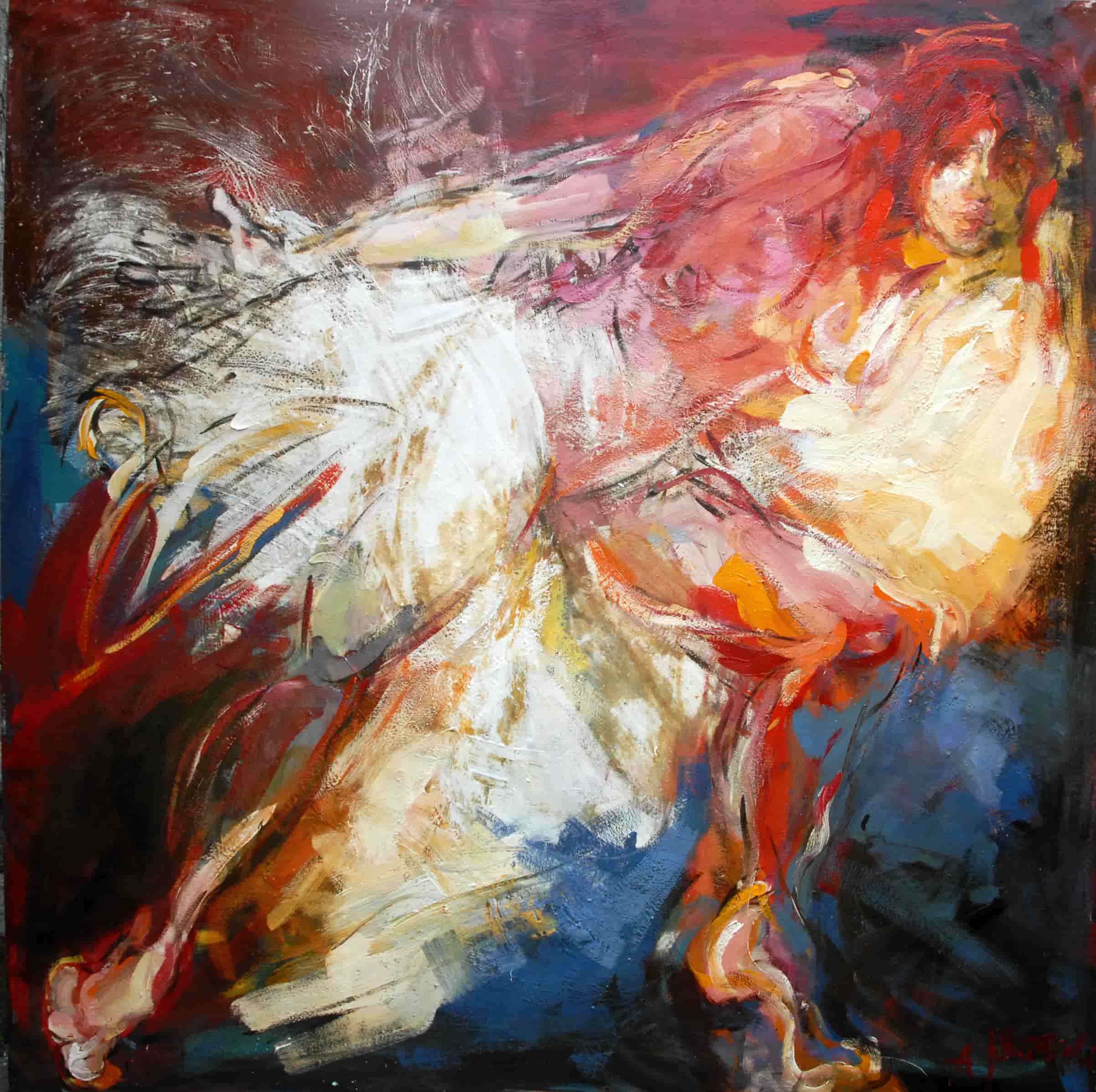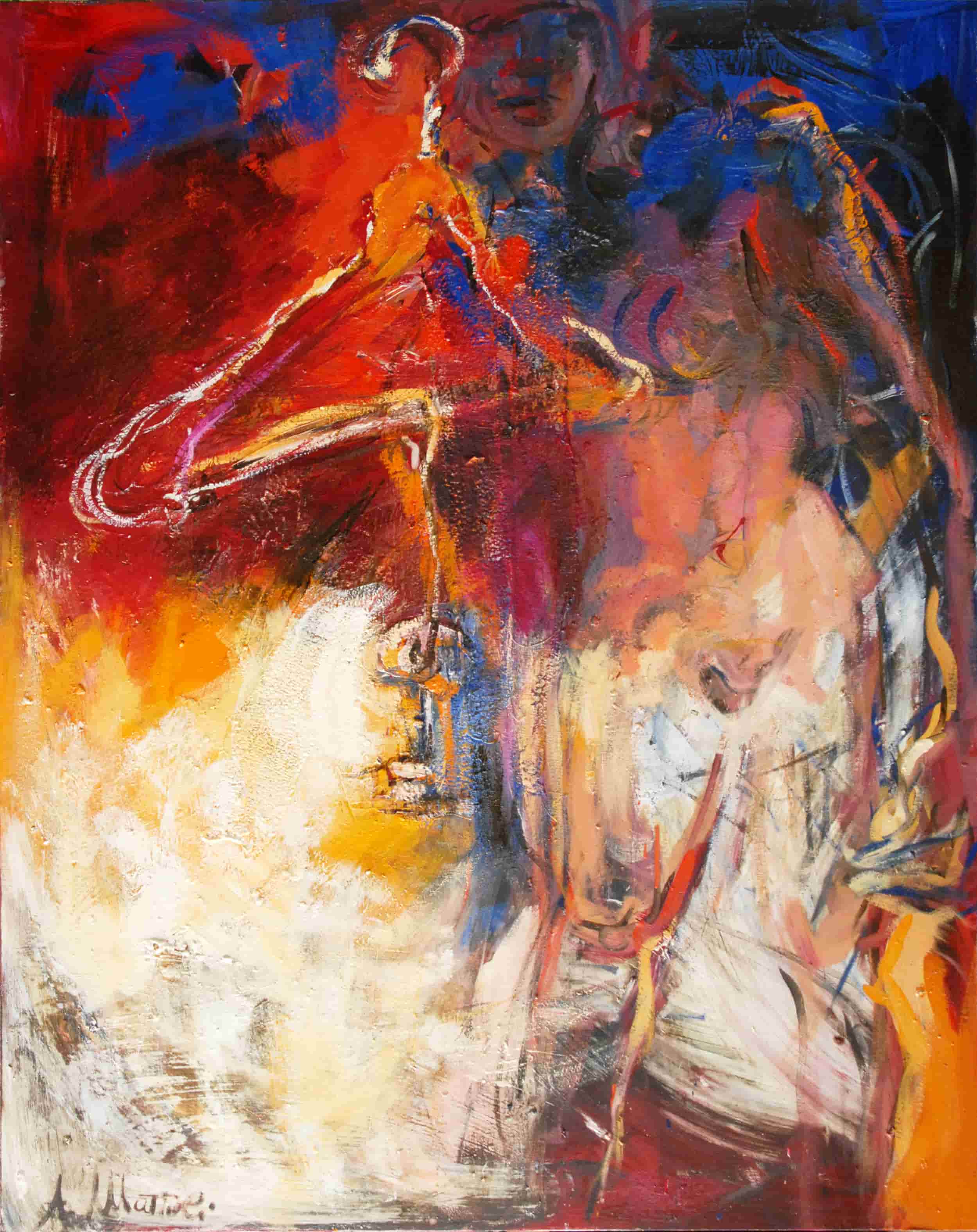 Riflettendo sulla società moderna il mio pensiero si è soffermato sull'esteriorità. Quanto pesa ciò che vediamo al di fuori rispetto a quello che in realtà siamo. Ho introdotto nei miei lavori l'omino (apprendi abiti, gruccia) come simbolo di essenza, anima, interiorità. Le figure sono nude, immobili ad ascoltarsi o in movimento per sfuggire a qualche tormento.