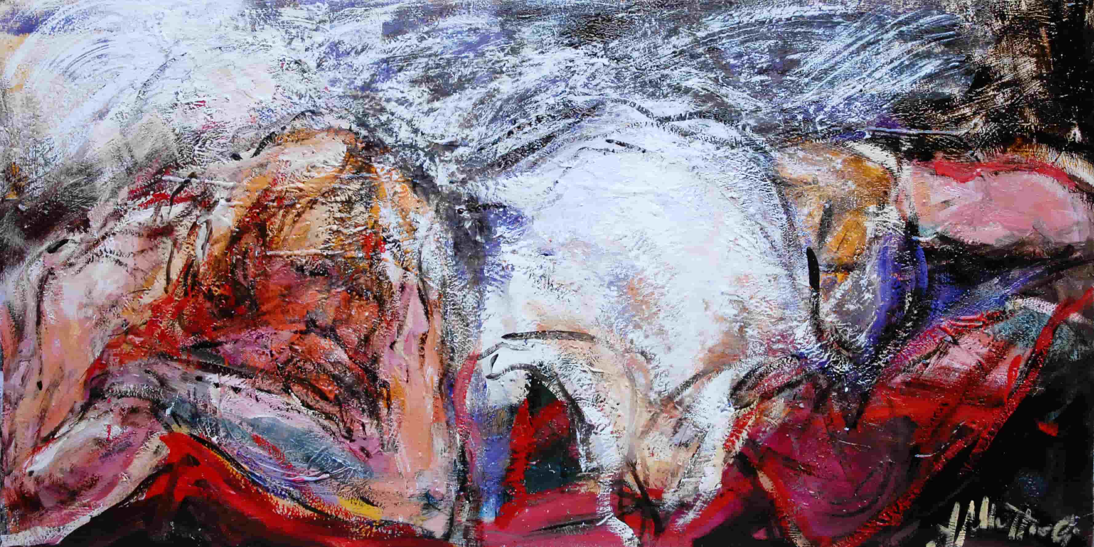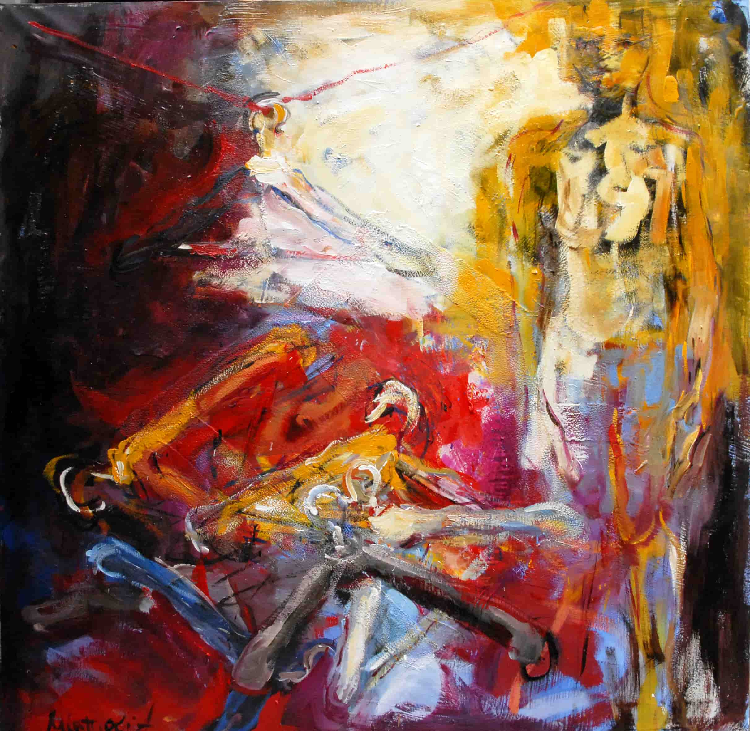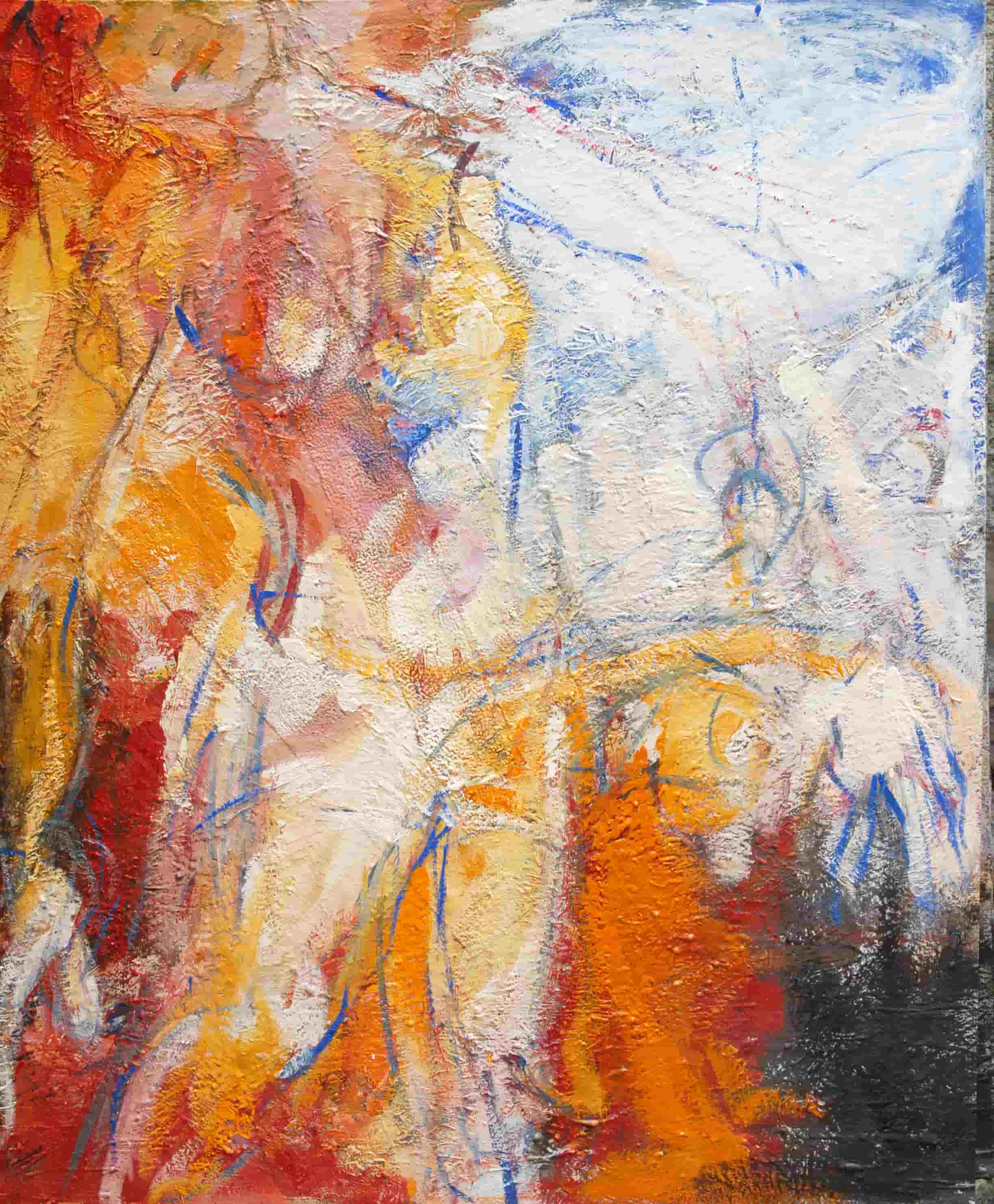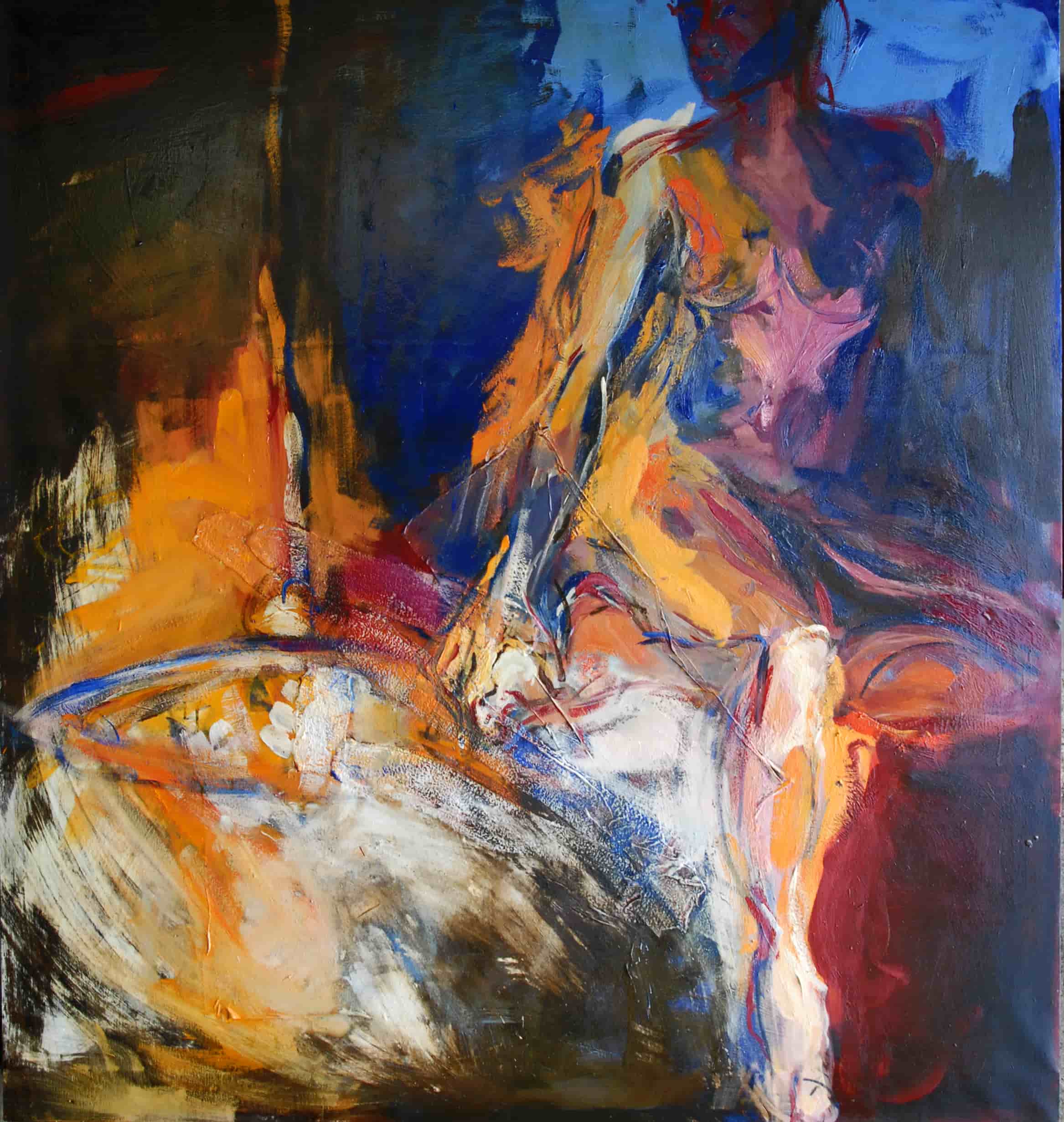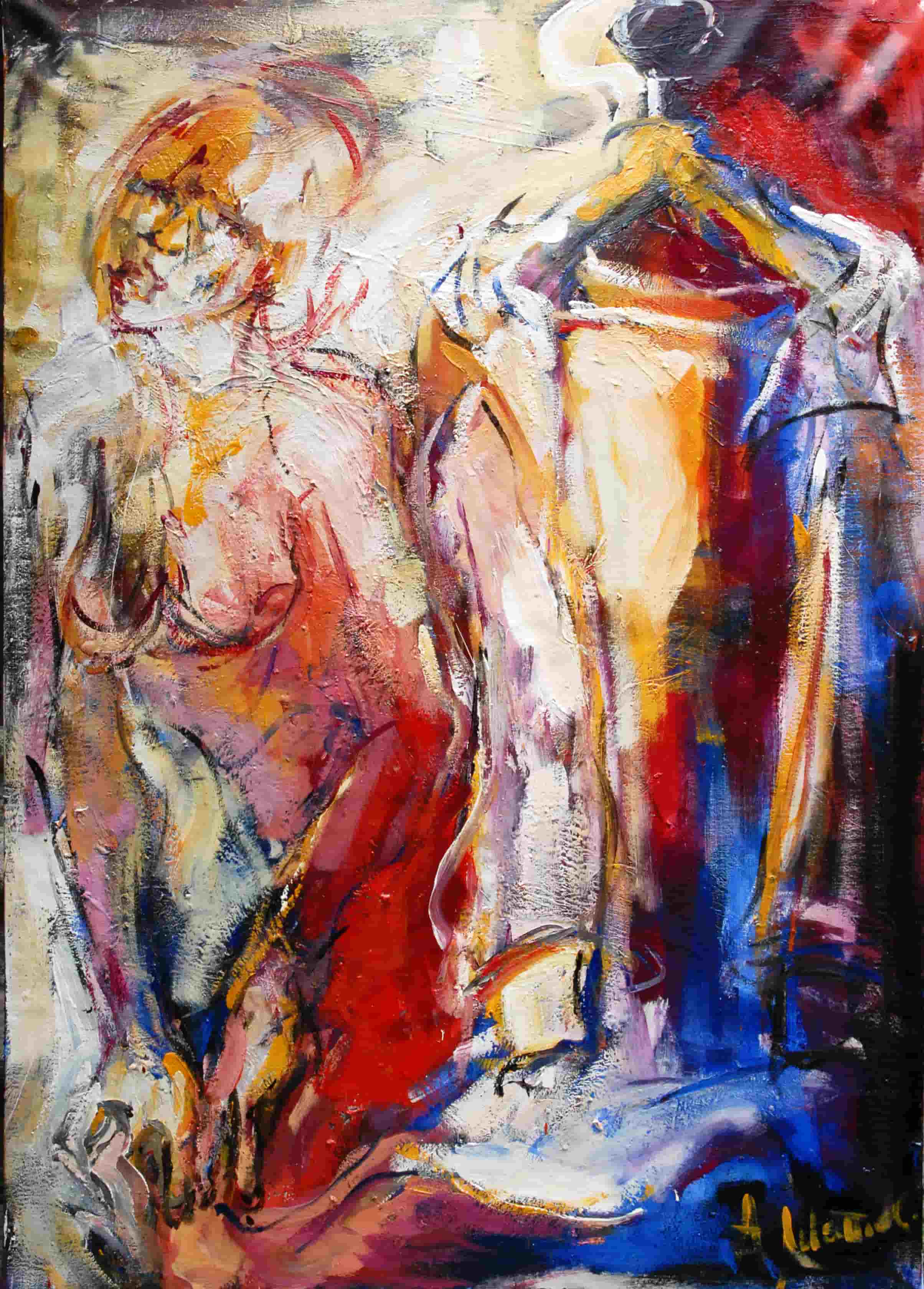 Riflettendo sulla società moderna il mio pensiero si è soffermato sull'esteriorità. Quanto pesa ciò che vediamo al di fuori rispetto a quello che in realtà siamo. Ho introdotto nei miei lavori l'omino (apprendi abiti, gruccia) come simbolo di essenza, anima, interiorità. Le figure sono nude, immobili ad ascoltarsi o in movimento per sfuggire a qualche tormento.